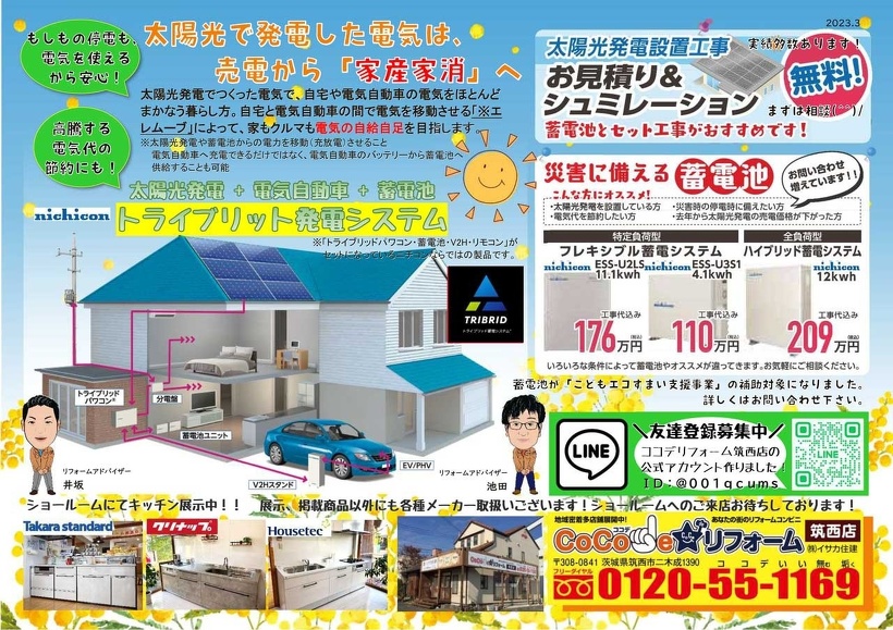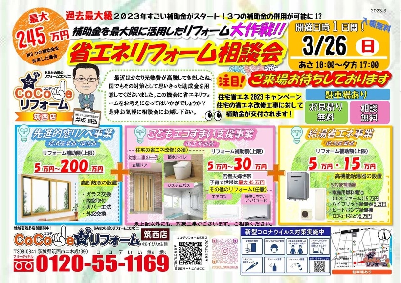 2023年03月24日(金) お知らせ 【イベント】2023.3.26省エネリフォーム相談会【筑西店(茨城)】 省エネリフォーム相談会 補助金を最大限に活用したリフォーム大作戦!! 開催日時は1日間! 3/26(日)AM10:00~17:00 過去最大級 202年すごい補助金がスタート!3つの補助金の併用が可能に!? 皆様のご来場をお待ちしております。