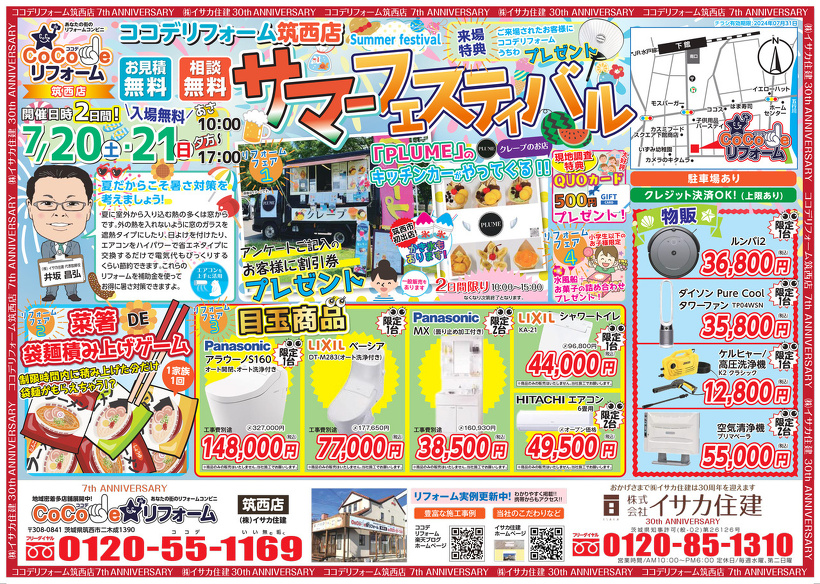 2024年07月19日(金) お知らせ 【イベント】サマーフェスティバル7/20(土)・21(日)【筑西店(茨城)】 サマーフェスティバルを開催します! 開催日時:7/20(土)・21(日) 10:00~17:00 「PLUME」(クレープのお店)のキッチンカーがやってくる! 菜箸DE袋麺積み上げゲーム 目玉商品 ご来場特典:ココデリフォームうちわをプレゼント 皆様のご来場をお待ちしております。