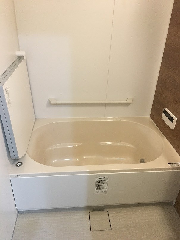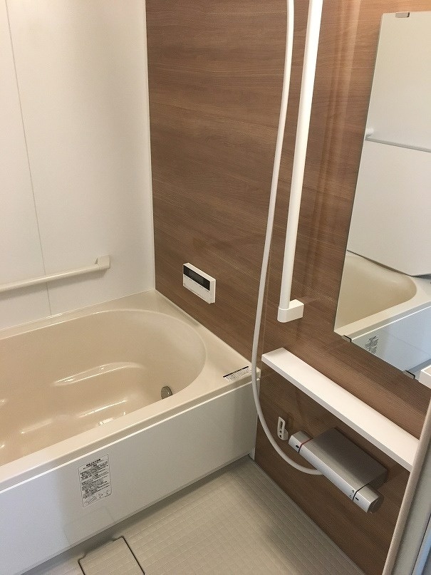 浴室の壁パネルは正面のアクセントパネルを濃い茶系にして洗面室の壁、床の色と合わせる事で清潔感のある落ち着いた浴室空間に生まれ変わりました。