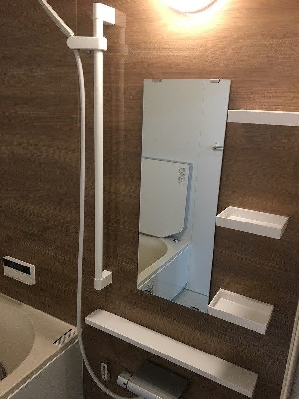 2日目に水栓や収納棚、鏡といった器具付けを行い浴室の工事は完了しました。