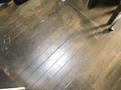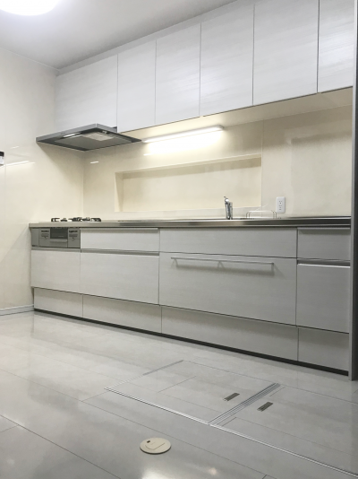今にも抜けそうな床と古くなっていたキッチンをリフォーム。 床、壁、天井、キッチン、全て白にし暗かったキッチンがとても明るい空間に変身しました。